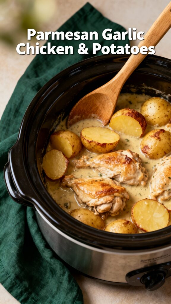 A cozy dump-and-go crockpot dinner with tender chicken, buttery potatoes, and rich parmesan garlic sauce.