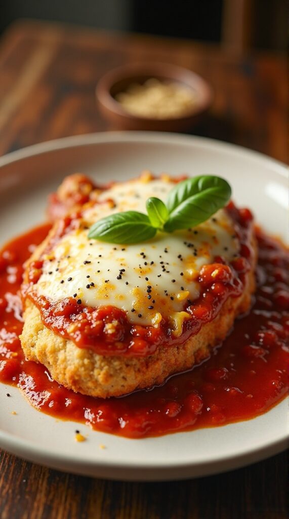 Crispy breaded chicken baked instead of fried, layered with marinara and melted cheese. It’s nostalgic, filling, and always reliable.