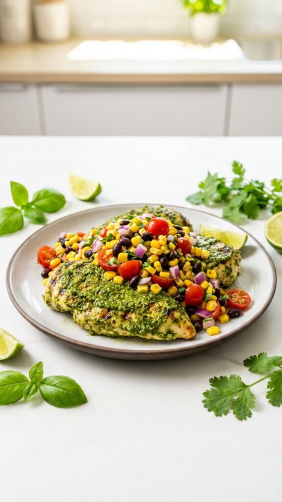 2. Pesto Chicken with Corn and Bean Salsa