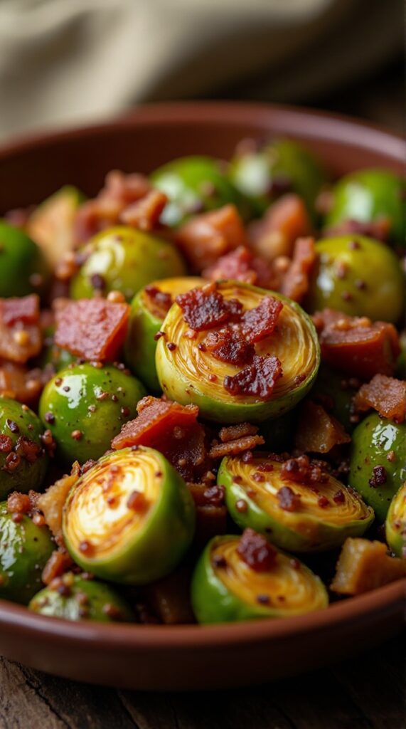 Roasted sprouts, crispy bacon, and a light glaze create a hearty vegetable-forward meal that still feels indulgent.